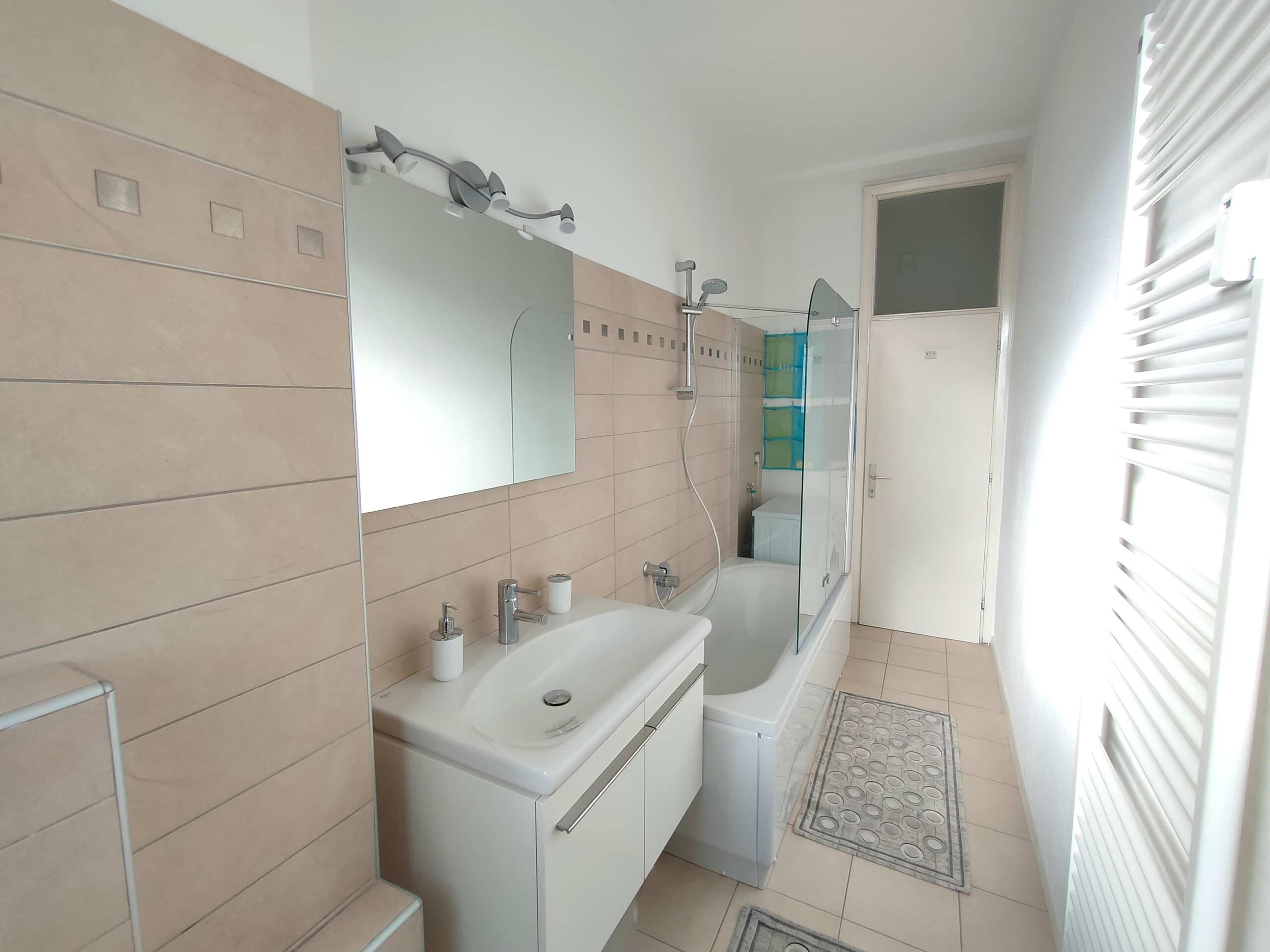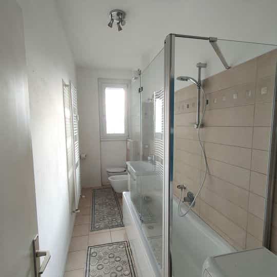5) Bagno finestrato con wc, bidet, mobile lavandino, vasca e sopravasca per doccia, porta oggetti a muro, lavatrice.