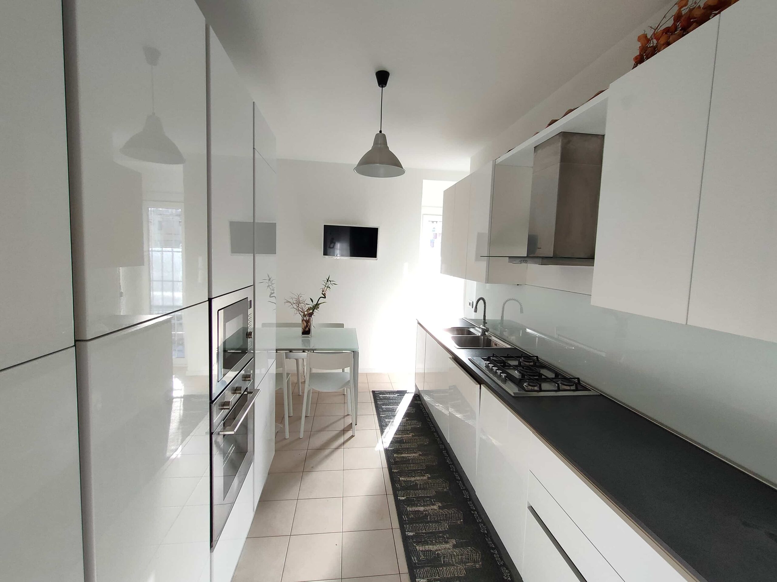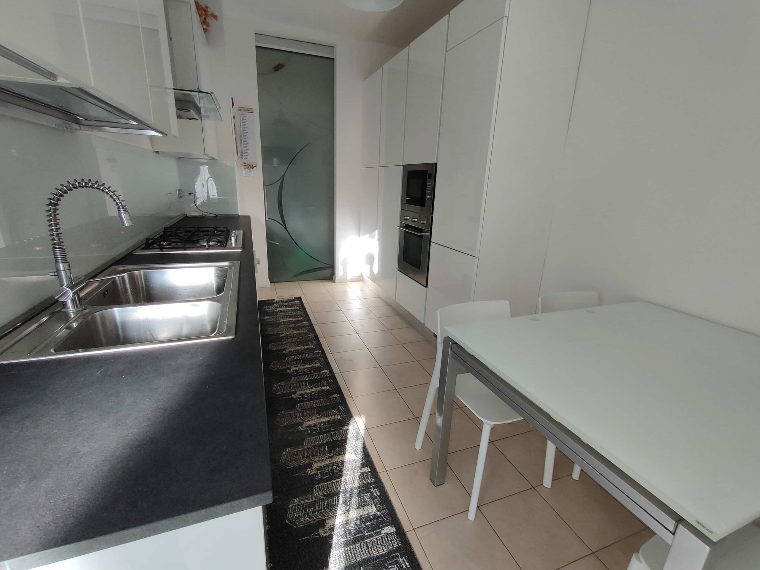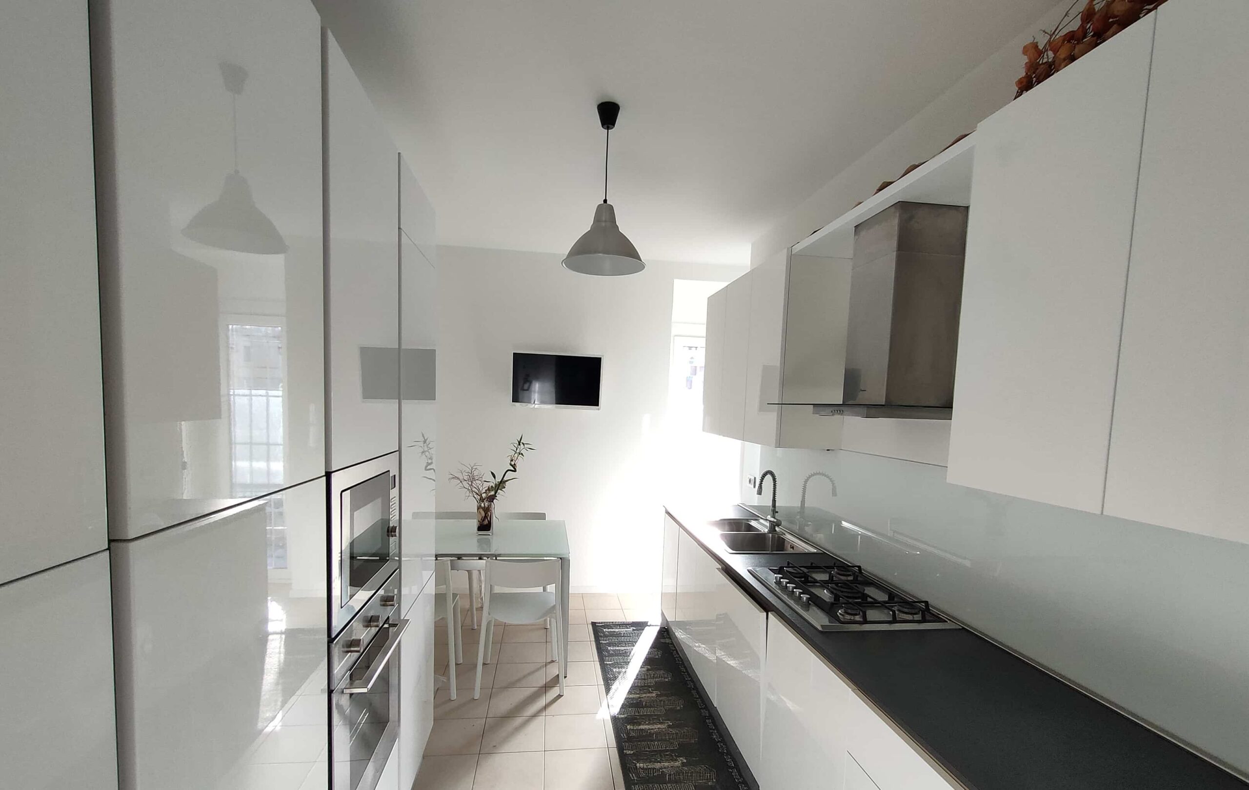 4) Cucina multiaccessoriata con piano cottura 5 fuochi, lavastoviglie, forno, microonde, frigo e freezer, tavolo 4 posti allungabile, televisore 32”, accesso al balcone.