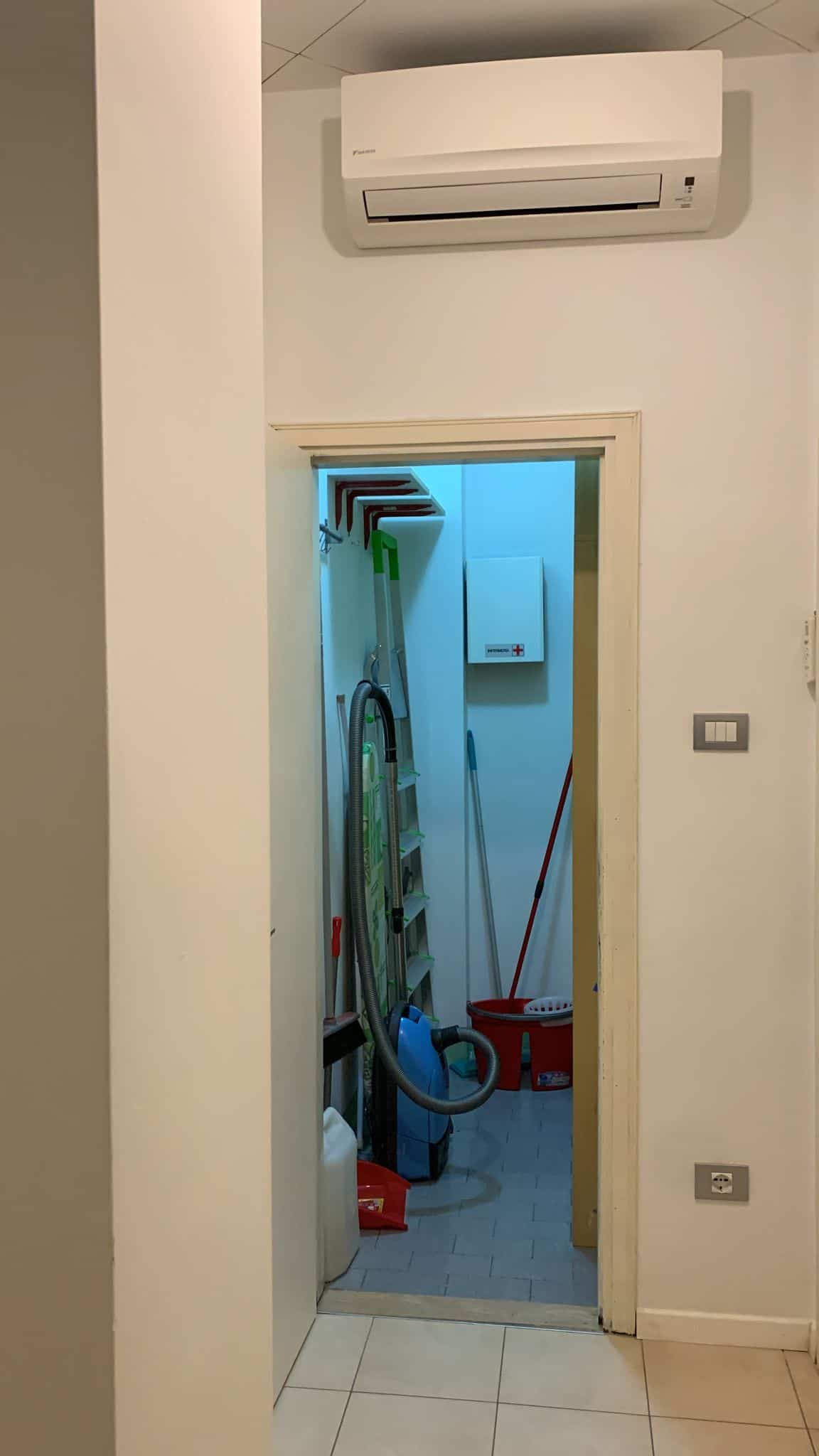 6) Ripostiglio, con armadio e scaffali, accessori per la pulizia e aspirapolvere, asse e ferro da stiro.
