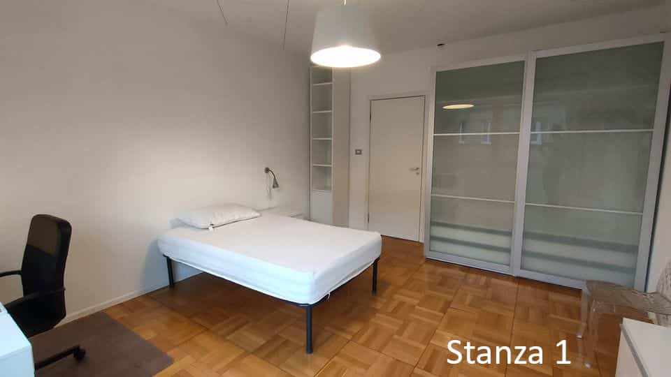 1) Stanza 1 (occupata): letto una piazza e mezzo, armadio a 2 ante, comodino, scrivania con sedia e cassettiera, lampada da scrivania, libreria, mobile tv e mensola, specchio, sedia aggiuntiva. 370€/mese + spese