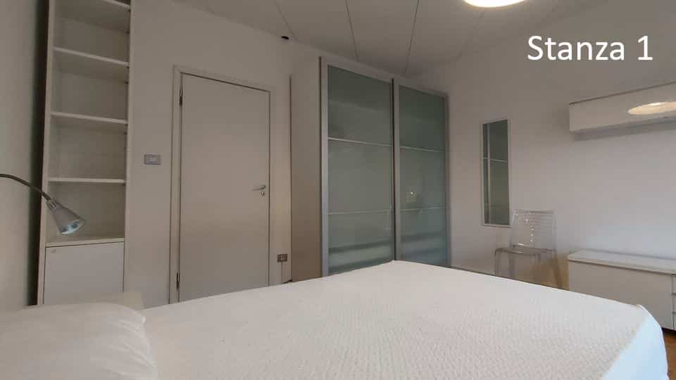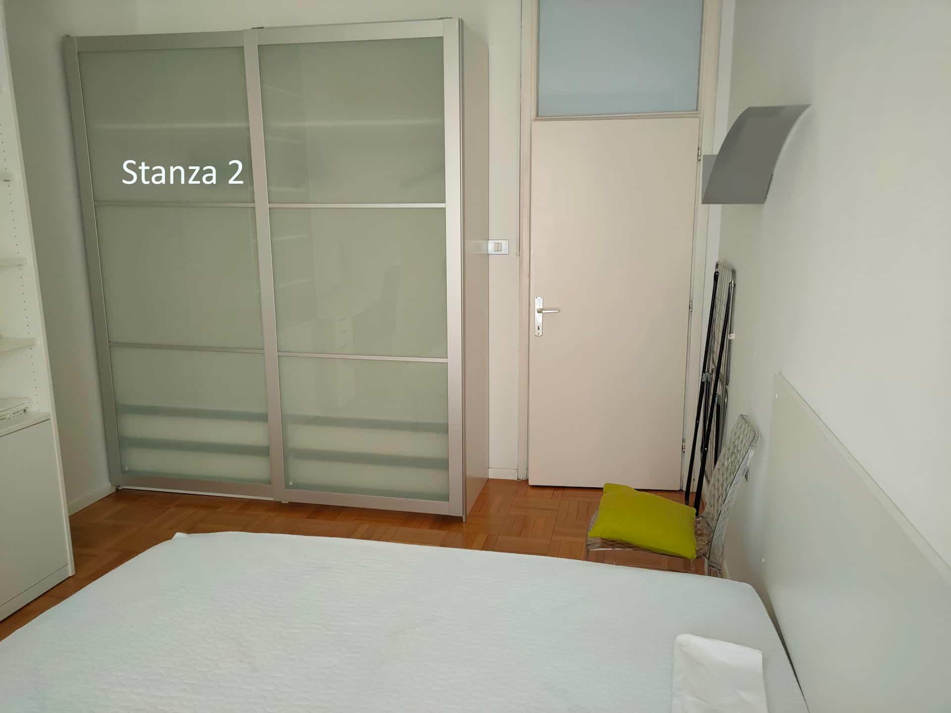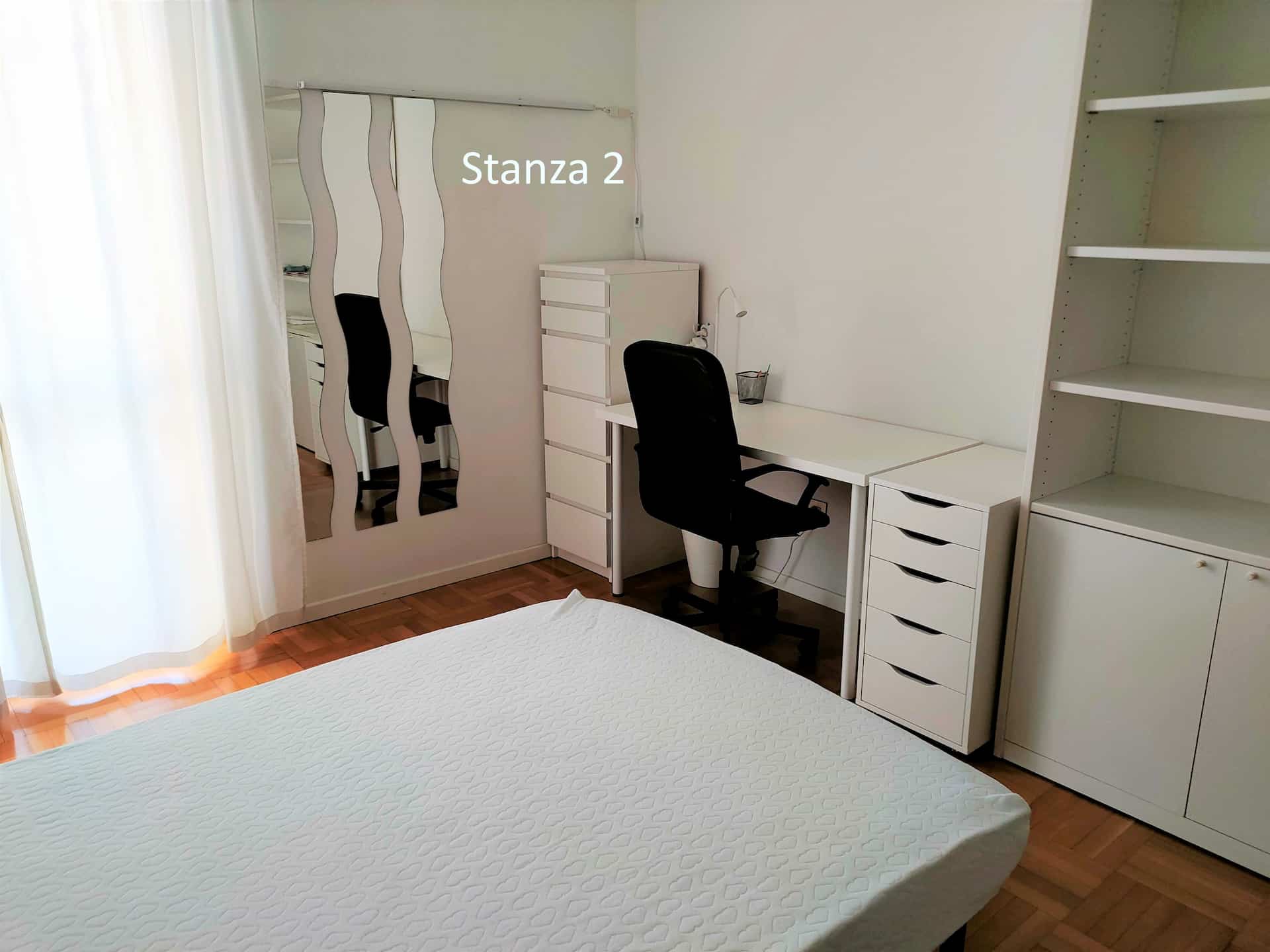 2)Stanza 2 (occupata): letto una piazza e mezzo, comodino, armadio a 2 ante, scrivania con sedia e cassettiera, lampada da scrivania, armadio con scaffali, cassettiera con specchio, mensola, sedia aggiuntiva, accesso diretto al balcone. 360€/mese + spese