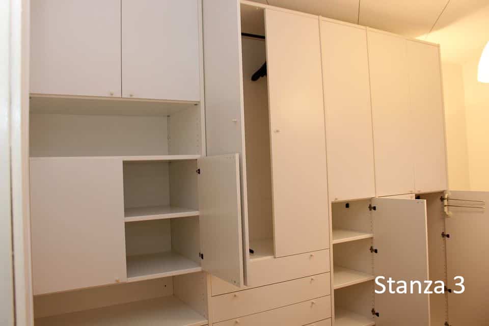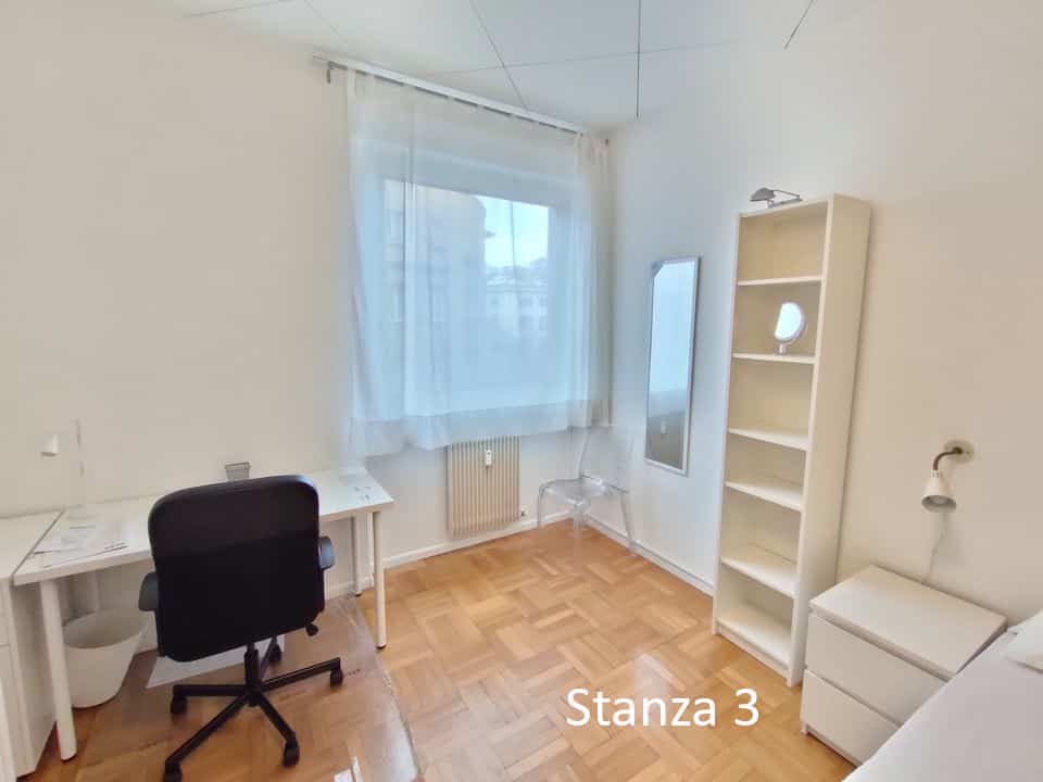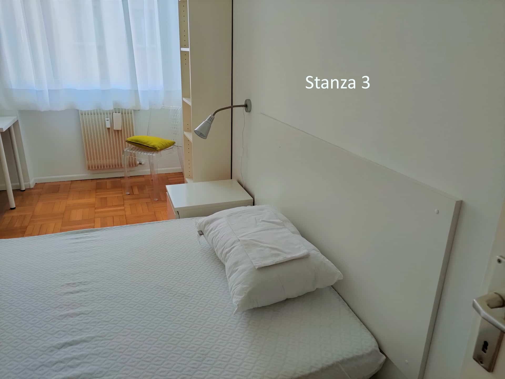 3) Stanza 3 (occupata): letto una piazza e mezzo, comodino, armadio a 4 ante, scrivania con sedia e cassettiera, lampada da scrivania, libreria, mensola, specchio, sedia aggiuntiva. 350€/mese + spese